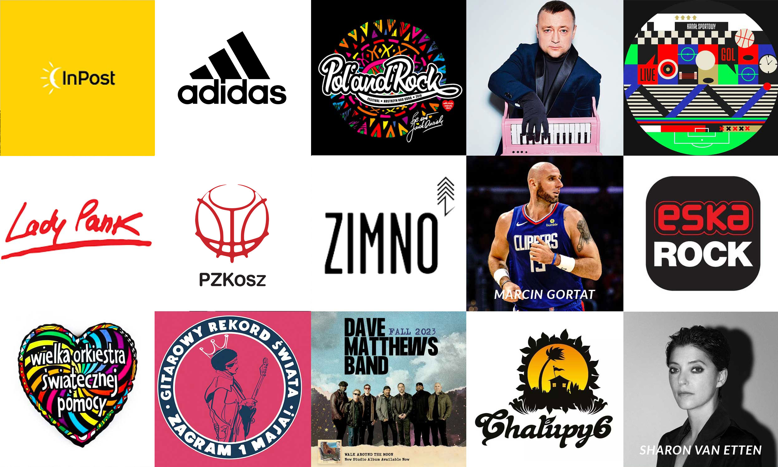 adidas | PZ Kosz | InPost |Skunk Anansie | Sharon van Etten | Dave Matthews Band | Chałupy 6  Pol’and’Rock Festival ZIMNO Wielka Orkiestra Świątecznej Pomocy Kanał Sportowy Kabaret Neonówka Lady Pank IRA Czesław Śpiewa Myslovitz Gitarowy Rekord Świata we Wrocławiu Fundacja Marcina Gortata Klub Odra Opole  | ESKA Rock | Poluzjanci | Miasto Wrocław | Miasto Opole | T.LOVE |